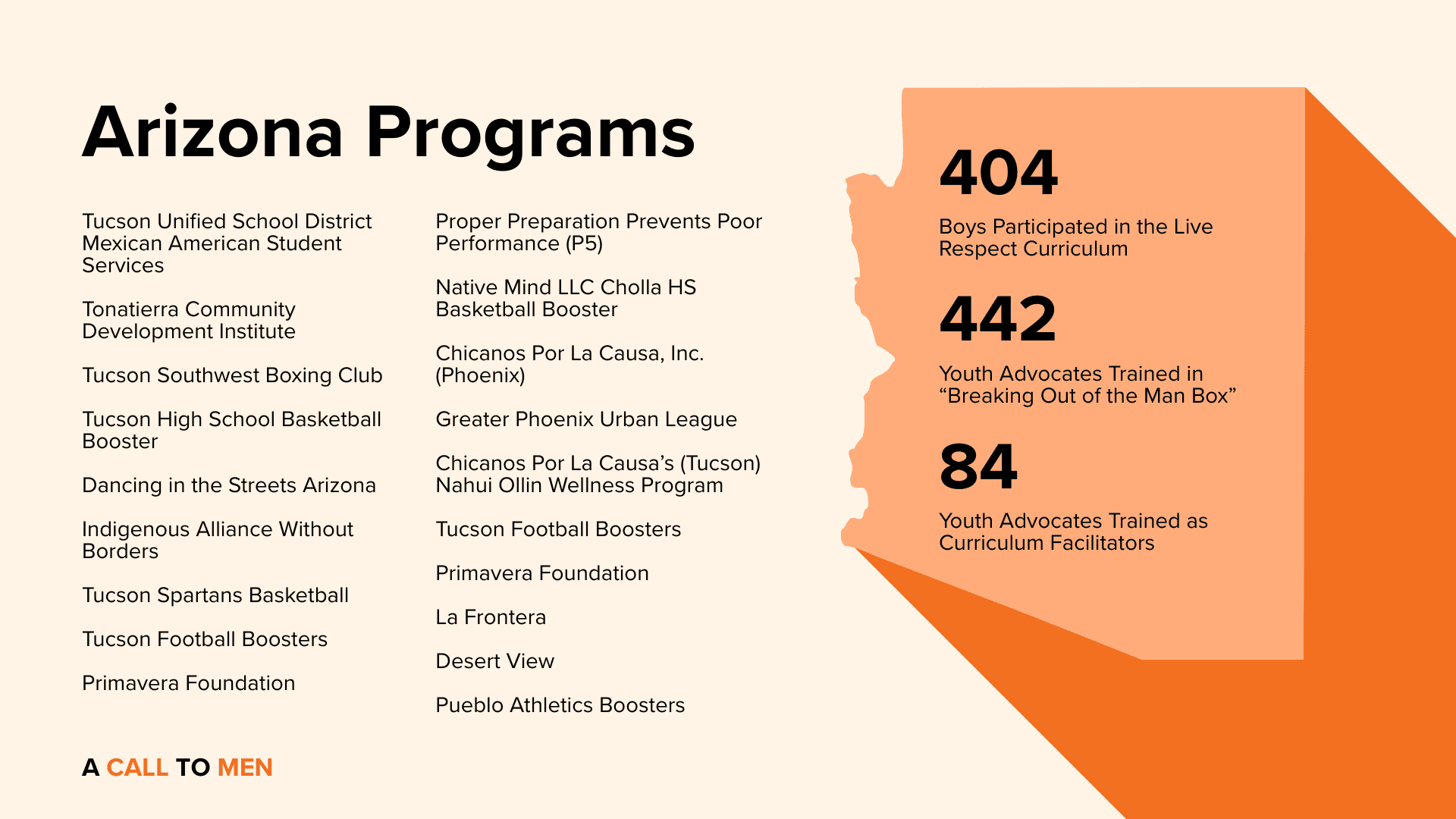 A Call to Men’s Programs Area had another exciting year, focusing on programmatic deliverables that support the organization's vision and mission. We believe that the foundation of our department is our commitment to 'meeting people where they are,' which enables us to provide in-person as well as virtual training in multiple areas, including professional sports, colleges and universities, middle and high schools, military installations, faith-based organizations, community-based organizations, and other relevant environments.